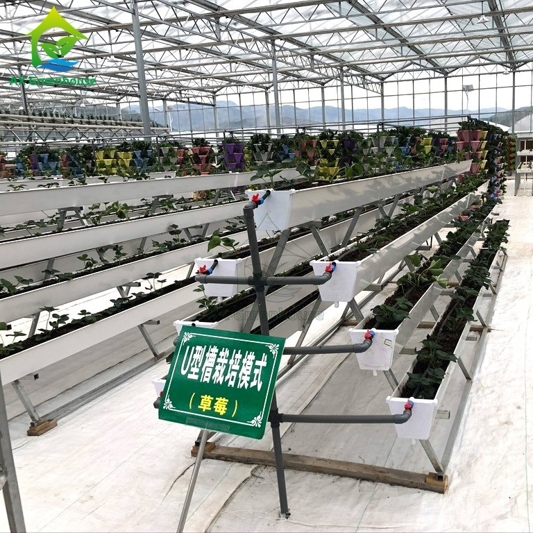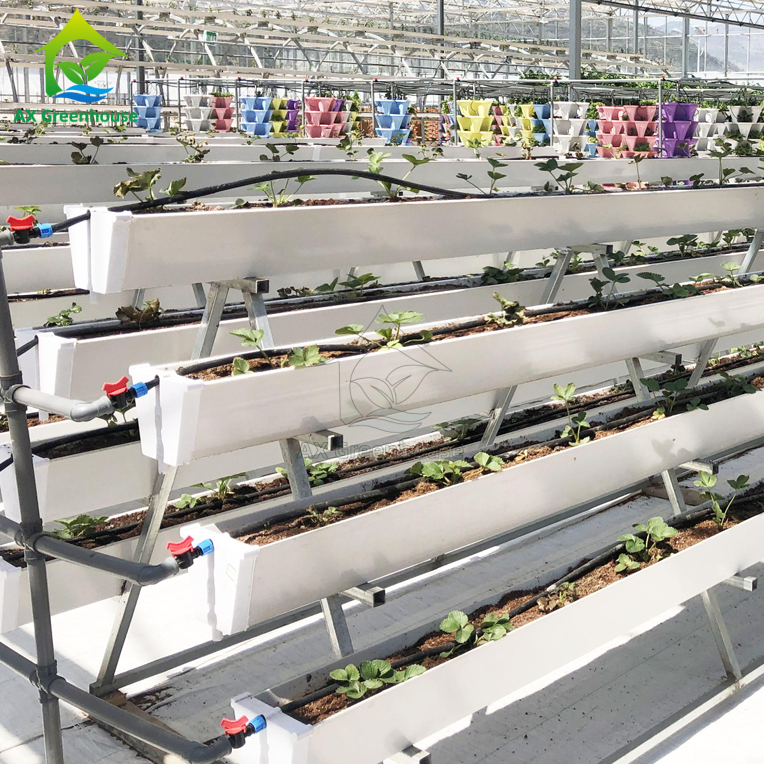 A-frame planting troughs are mostly used for strawberry planting. Its main frame is a steel structure. 3 to 4 layers of cultivation troughs are installed on the left and right sides of the cultivation frame, and the layer spacing is about 40 cm. The planting troughs are generally made of pvc raw materials. The shape of the trough is mostly trapezoid, and the bottom is designed with a drainage ditch to facilitate the drainage of excess water.